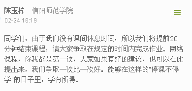 2020年2月24日是信阳师范学院网上教学的第一天。当日上午,云顶yd2223线路检测全体师生同上了学校举办的“网上教学第一课”,当日下午,公司专业课授课老师顺利开展了“网上教学第一课”。