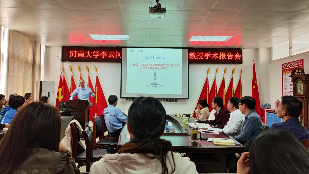 2023年3月9日上午,应云顶yd2223线路检测邀请,河南大学周树堂教授和李云河教授在生物楼412会议室,分别做了题为“昆虫高生殖力的遗传基础与分子调控机制解析”和“二化螟与褐飞虱协作应对水稻抗虫防御的生态和分子机制”的学术报告,公司青年教师及部分员工聆听了报告。报告会由经理饶本强教授主持。