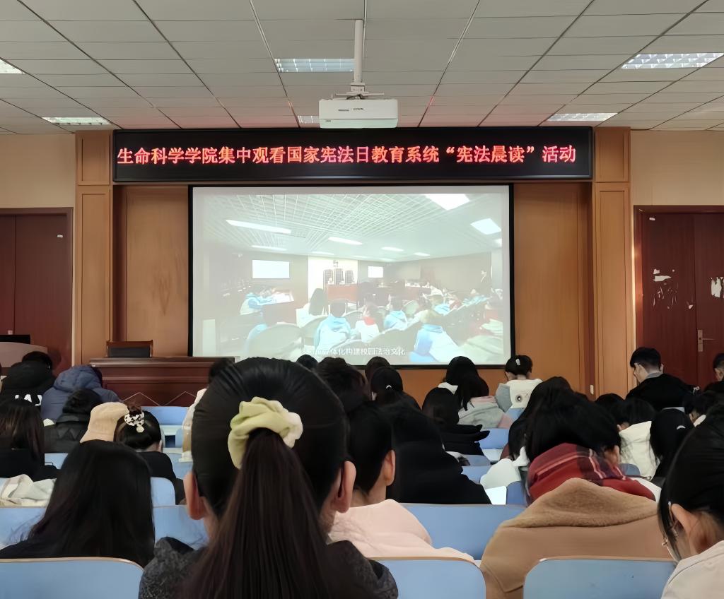 上午9时30分,直播正式开始,本次直播充设置了主会场和全国各地及多个大、中、小学分会场,旨在将宪法教育与学校教育相结合。通过直播,同学们首先收看到了第八届全国员工“学宪法,讲宪法”活动的精彩瞬间,接着开始“宪法晨读”活动的正式议程。活动由教育部政策法规司王大泉副司长主持,他指出,本次活动是贯彻落实习近平法治思想,久久为功,弘扬宪法精神,培育宪法意识的生动实践。教育部政策法规司司长邓传淮领读宪法部分条款,主会场、分会场以及报告厅内全体人员起立,庄严跟读。主会场领唱《宪法伴我们成长》歌曲,同学们激情跟唱。同学们认识到要信念如磐,高举宪法大旗,弘扬宪法精神,奋楫笃行,维护以宪法为核心的中国特色社会主义法治体系。