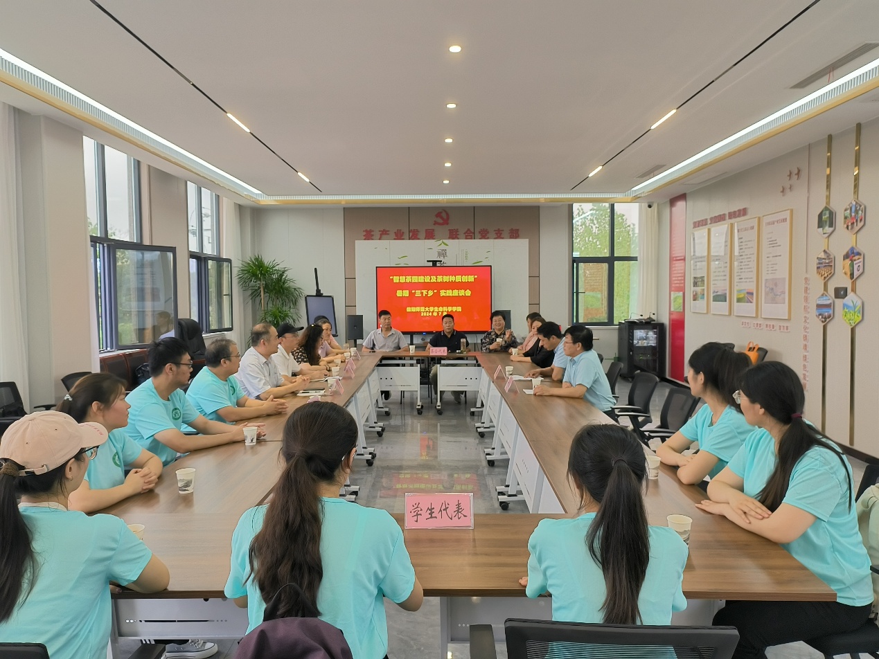 在河南省茶树良种繁育场,实践团队针对茶苗繁育过程中的南茶北移、茶树寻根、栽培管理、病虫防治、育种持续化等遇到的技术难题等,结合自己科研成果和实践经验,提出了建设性意见和建议,并就茶树种质创新、新品种培养及推广联合攻关、科研成果转化等进行深入交流并达成了初步合作意向。