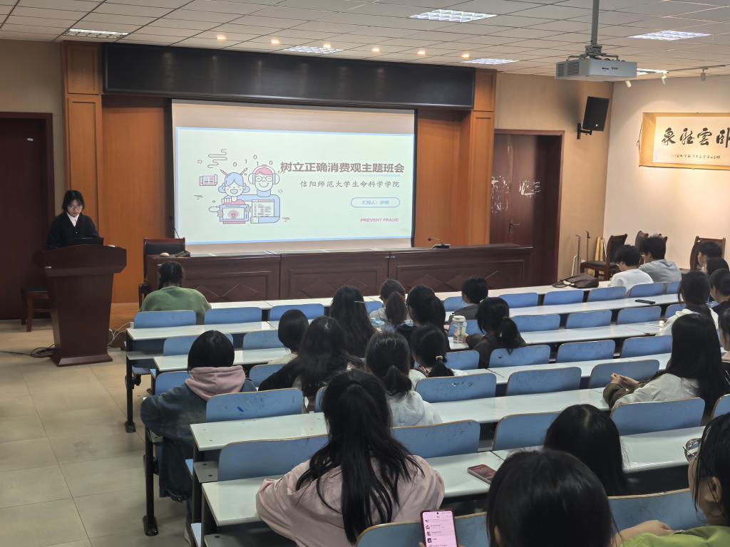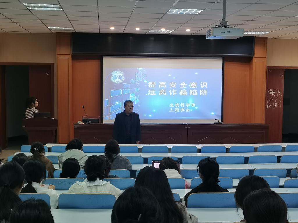 为加强同学们的安全意识,打造良好安全的校园环境。11月8号,公司在生科楼414报告厅召开2024级预防诈骗及树立正确消费观主题班会。会议由2024级专职辅导员洪瑞主持,党委副书记荣宪举、2024级生物科学全体同学参加会议。