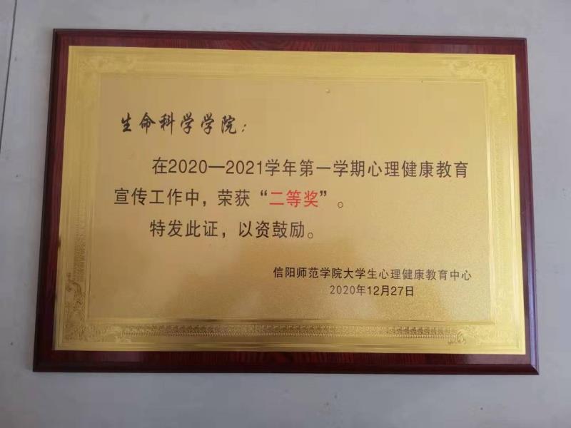 12月29日晚七点,信阳师范学院老员工心理健康教育中心在逸夫楼报告厅举办“信阳师范学院老员工心理健康教育中心2021年元旦晚会暨年度表彰大会”活动。经评定,公司在心理游园会活动评比中位列前茅,在2020-2021学年第一学期心理健康教育宣传工作中,表现突出,荣获“二等奖”佳绩,公司学子郭文利,杨胜男,吴宇被评为“优秀心理工作者”。