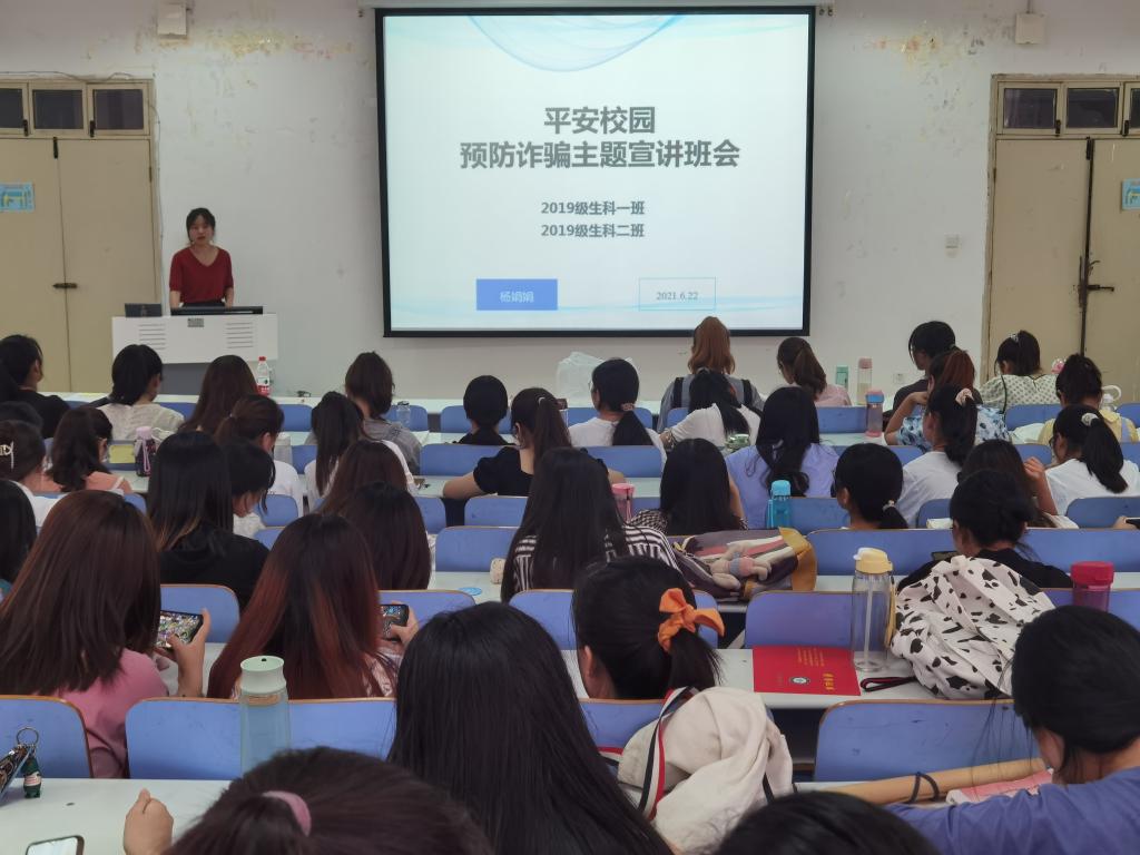 为深入贯彻安全教育工作,营造安全的校园环境,6月22日,公司于生物楼414多媒体教室召开2019级预防诈骗主题宣讲班会。该班会由19级专职辅导员杨娟娟主讲,2019级全体同学参加。