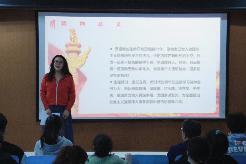 活动伊始,荣宪举进行发言:“青年是国家的希望、民族的未来,号召同学们在全党以及全国各族人民对党的二十大充满期待的时刻,要肩负起青年责任,以奋进的新姿态迎接党的二十大召开,用优异的成绩向党的二十大献礼,为实现第二个百年奋斗目标,为实现中华民族伟大复兴的中国梦而努力奋斗。”熊蕾以微团课的方式讲述罗盛教的故事,用他只有短短二十一年但却光辉璀璨、永远闪耀在新时代上空的一生,激励同学们将个人理想与党,与国家紧密相连。随后,主持人对五四运动的历史背景、历史意义等进行现场介绍,带领同学们重温历史,深刻明白了中国共产党的地位及重要性。主持人结合PPT,以主题班会的形式讲解关于党的发展历程中一些感人肺腑的事件,同学们更加深入的了解了党的伟大。在才艺展示环节,2020级食品科学与工程班的同学们抑扬顿挫的朗诵《五四赞歌》,宣扬五四精神,点燃青春火炬;2020级生物技术班的同学们用嘹亮的歌声合唱《最美的太阳》,寓意祖国是广阔天空的最美太阳,永恒的散发着光芒,指引人民前进的方向;2020级生物制药班的同学们用话剧向祖国献礼;叶丽娜·阿孜拜克和夏依旦·阿布力克木两位新疆同学用婀娜多姿的民族舞展示少数民族对党的领导的信任,五十六个民族团结一心,听党话,跟党走,念党恩,最后全体团员进行朗诵,用青春之声号召广大青年学子牢记党的教诲,响应党的号召,不负韶华,不负祖国,不负人民,为民族复兴贡献力量。