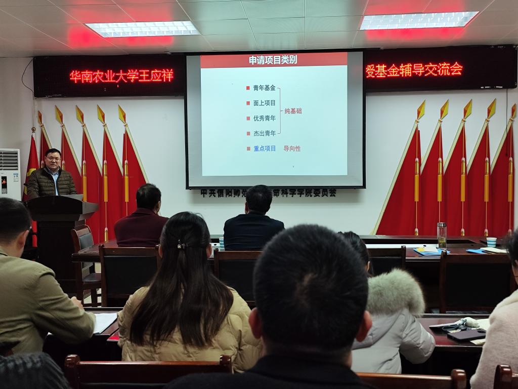 2023年11月30日,应云顶yd2223线路检测邀请,华南农业大学王应祥教授来公司指导国家自然科学基金申报工作。基金申报辅导报告会在412会议室举行。经理饶本强教授、副经理周棋赢及青年教师代表参加报告会。
