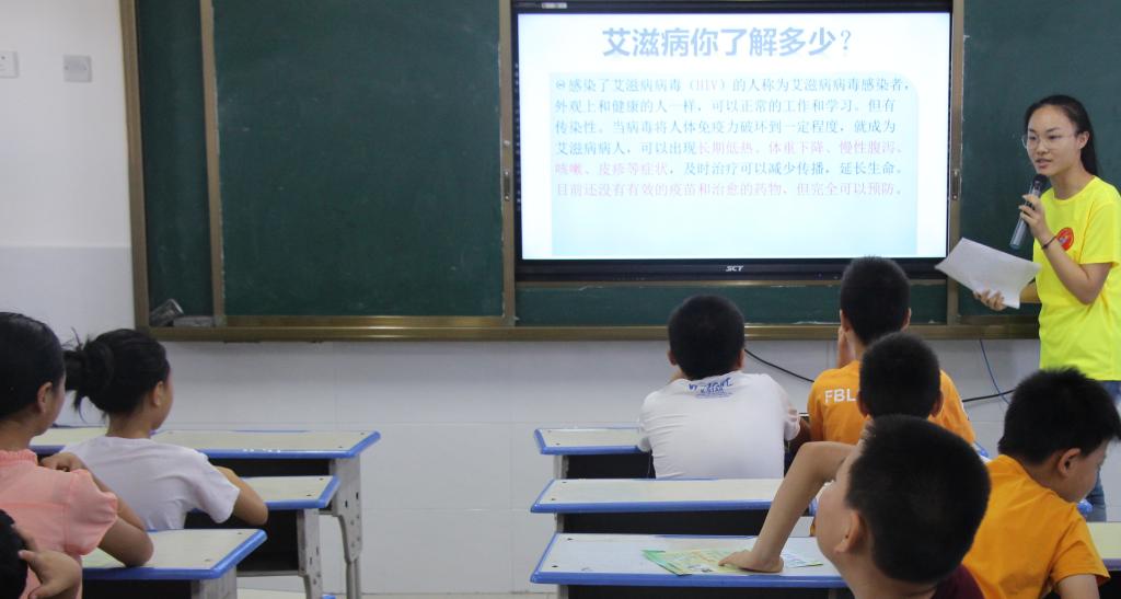 宣讲团成员来到教室后,给在座的家长和同学发放的有关艾滋病知识的宣传手册。生命科技协会会长程梦瑶代表服务团进行宣讲,她围绕艾滋病定义及临床表现、艾滋病的传播方式、艾滋病的预防措施及检测方式、如何对待艾滋病人四个方面向在座家长和员工们普及了艾滋病的相关常识。为了调动听众热情,宣讲团成员设问,听众抢答,发出学习用品奖励34件。宣将期间,结合挂图,听众提出自己的困惑,宣讲团成员结合阻断传播途径和平桥区实际案例为其答疑解惑,收到良好效果。