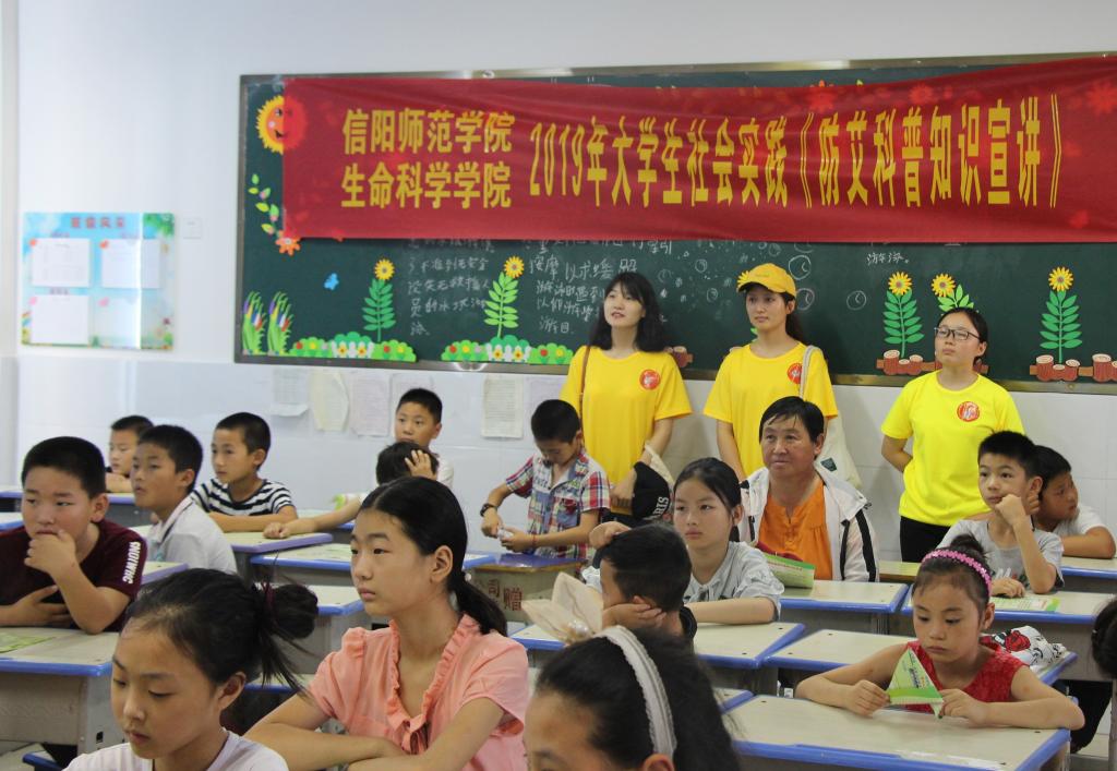 7月6日,公司暑期“三下乡”社会实践小分队,在党委副书记杨霁虹,专职组织员孙太红的带领下,来到平桥区洋河镇中心学校陆庙小学,开展“防艾”宣传教育活动。