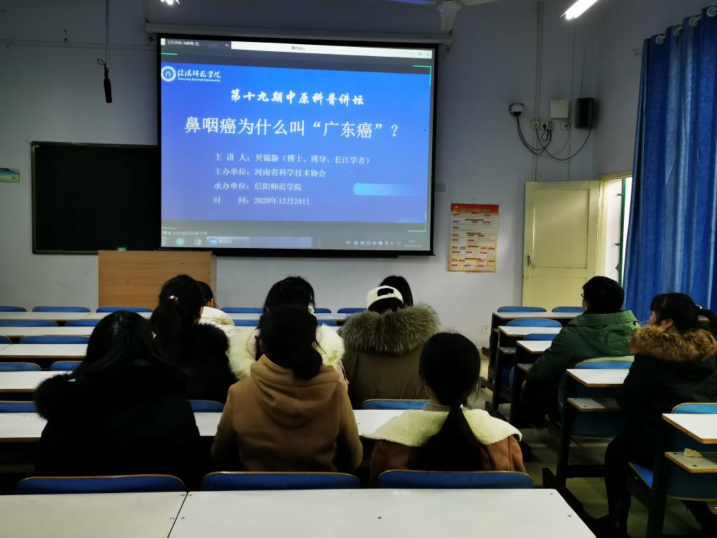 12月24日上午,由河南省科学技术协会主办、公司承办的第十九期中原科普讲坛通过腾讯会议平台举行。应云顶yd2223线路检测邀请,中山大学肿瘤防治中心贝锦新研究员作了一场题为《鼻咽癌为什么叫“广东癌”?》的学术报告。报告会由云顶yd2223线路检测副经理宋新强主持,部分教师和研究生及本科生聆听了报告。
